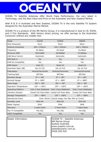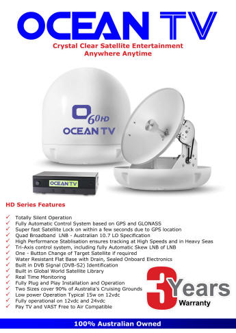 Whether Game Fishing at Lizard Island, Cruising The Whitsundays, Tuna fishing off Port Lincoln, Salmon fishing off southern Tasmania, Anchored at Rottnest Island, relaxing on your Houseboat in Lake Eildon, cruising the Hawkesbury River in Sydney, relaxing in the Bay of Islands in NZ, there is a Ocean TV model to suit your lifestyle and boat. Compare with other brands, and you will see the Australian OCEAN TV wins on features, technology, warranty and price. Download a comparision of Other Brands in the Australian Market with OCEAN TV |